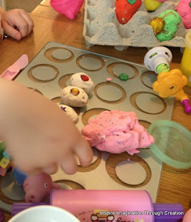 During the week we decided to have an Easter Egg sale! Little Boo mentioned doing her play dough cake stall so I suggested because it was Easter that we make an Easter egg stall instead. She was really keen so we set to work making the Play dough Easter Eggs to sell to her customers. Little Boo had a great time decorating the eggs with buttons and some sparkly gems.